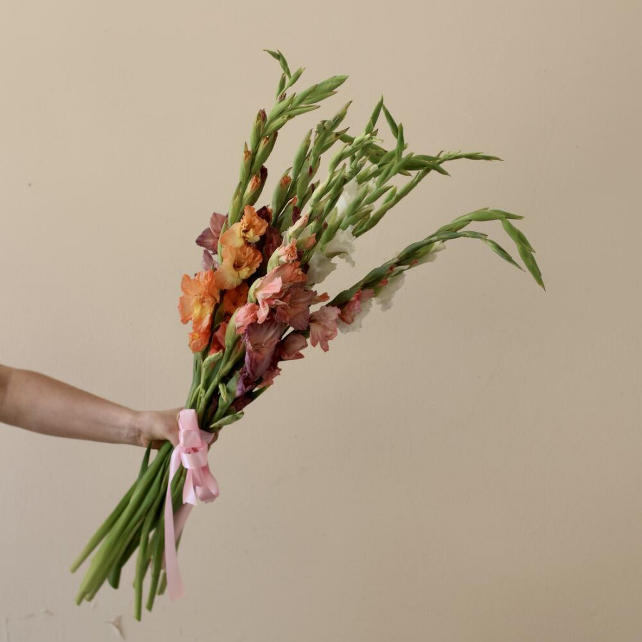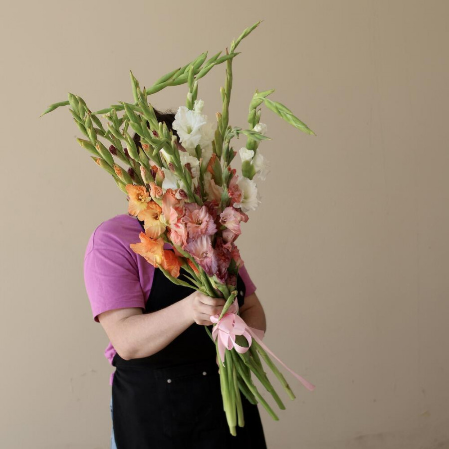 На фото букет из 11 разноцветных гладиолусов. В составе: гладиолус 11 шт, атласная лента 1 шт, . Все цветы свежие и ароматные, букет красиво оформлен и отлично подходит для подарка. Доступна доставка цветов или самовывоз.