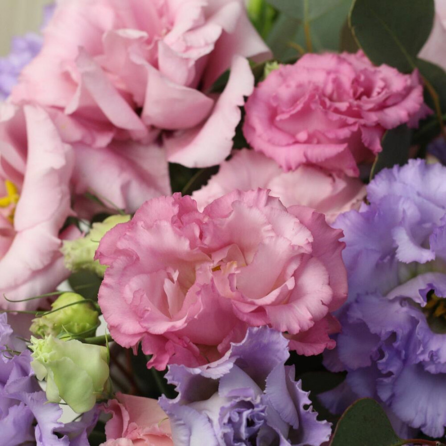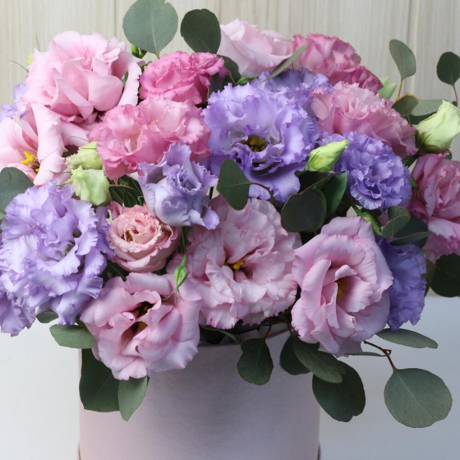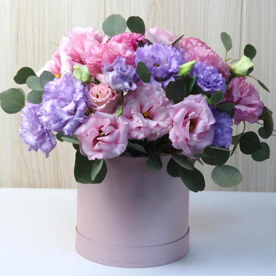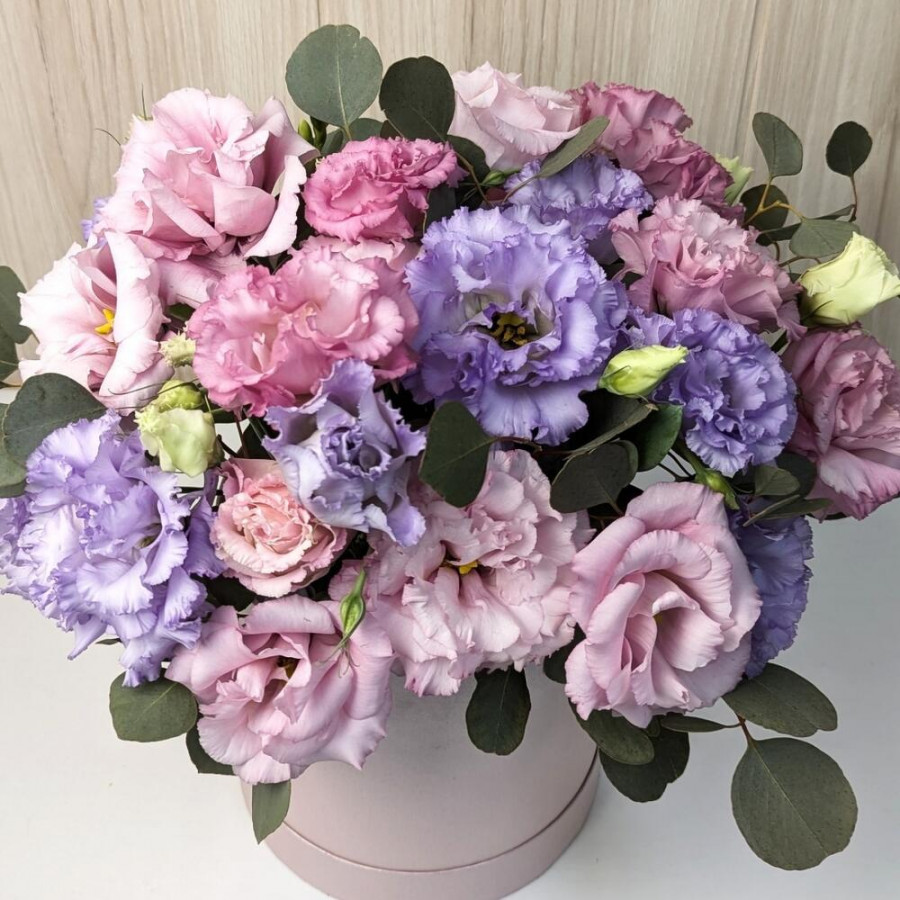 Букет из 15 розовых и сиреневых эустом в коробке в Елабуге