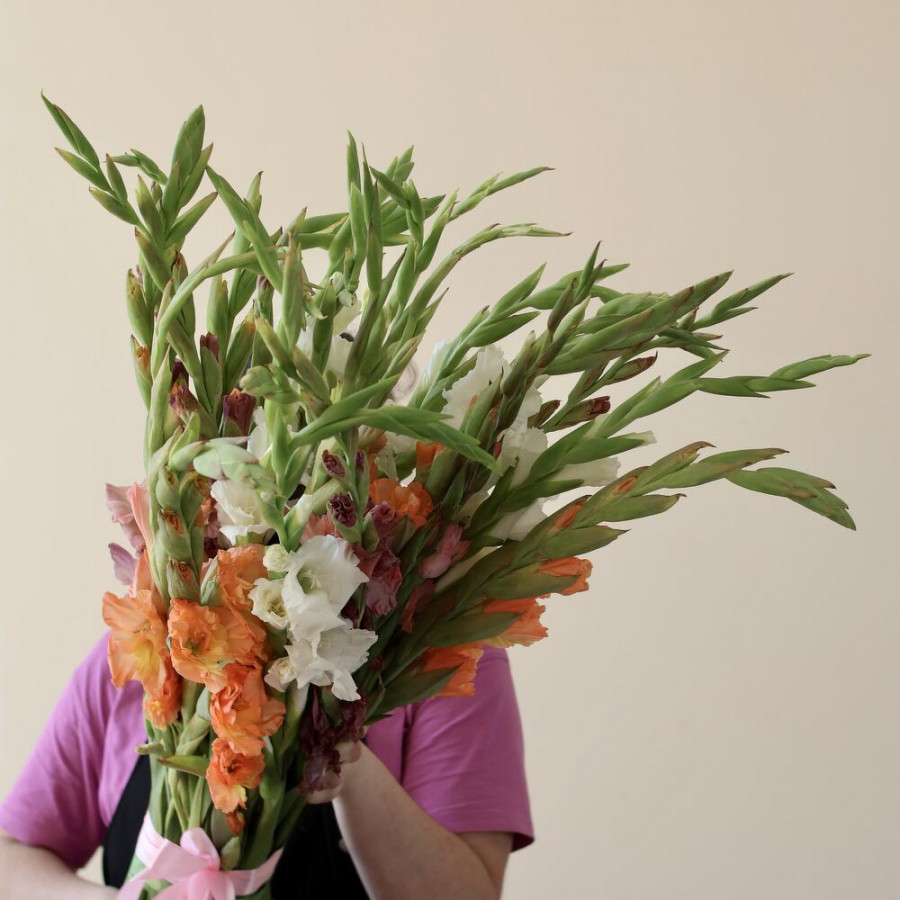 На фото букет из 25 микс гладиолусов. В составе: гладиолус 25 шт, атласная лента 1 шт, . Все цветы свежие и ароматные, букет красиво оформлен и отлично подходит для подарка. Доступна доставка цветов или самовывоз.