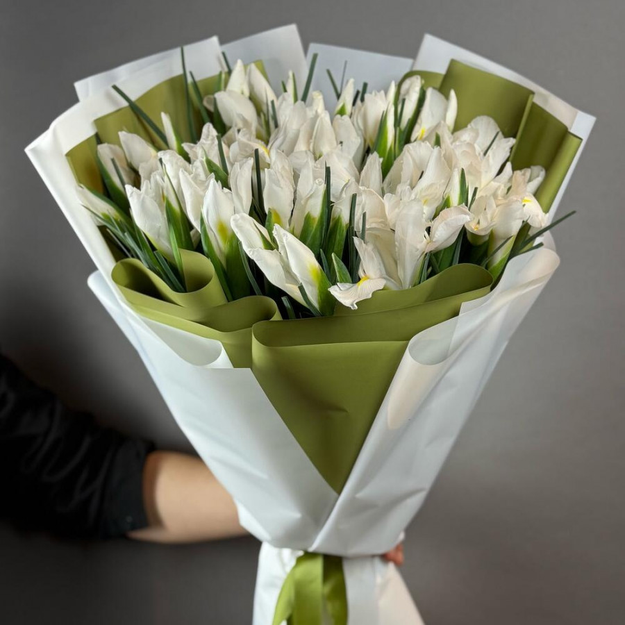Лента атласная - 1 шт. Пленка дизайнерская - 1 шт. открыточка - 1 шт. ирисы белые - 39 шт.