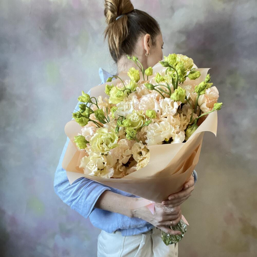 На фото букет 9 персиковых эустом. В составе: эустома (лизиантус) 9 шт, дизайнерская упаковка 2 шт, атласная лента 1 шт, . Все цветы свежие и ароматные, букет красиво оформлен и отлично подходит для подарка. Доступна доставка цветов или самовывоз.