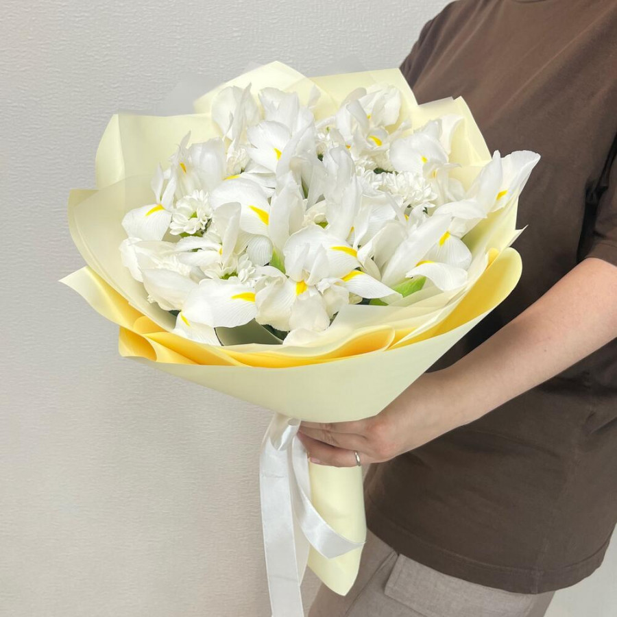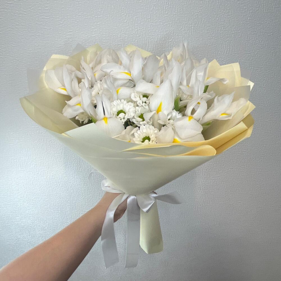 На фото букет из белых ирисов и белой хризантемы. В составе: ирис 11 шт, хризантема кустовая 4 шт, дизайнерская упаковка 1 шт, атласная лента 1 шт, . Все цветы свежие и ароматные, букет красиво оформлен и отлично подходит для подарка. Доступна доставка цветов или самовывоз.