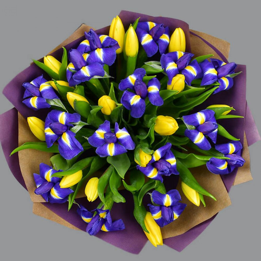 Букет из синих ирисов и желтых тюльпанов
