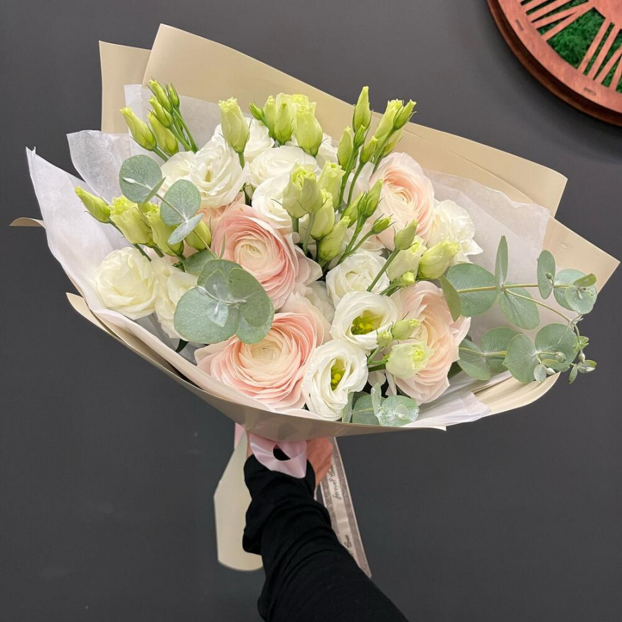 На фото букет из эустом и ранункулюсов. В составе: эустома (лизиантус) 4 шт, ранункулюс 5 шт, эвкалипт 3 шт, дизайнерская упаковка 1 шт, атласная лента 1 шт, . Все цветы свежие и ароматные, букет красиво оформлен и отлично подходит для подарка. Доступна доставка цветов или самовывоз.