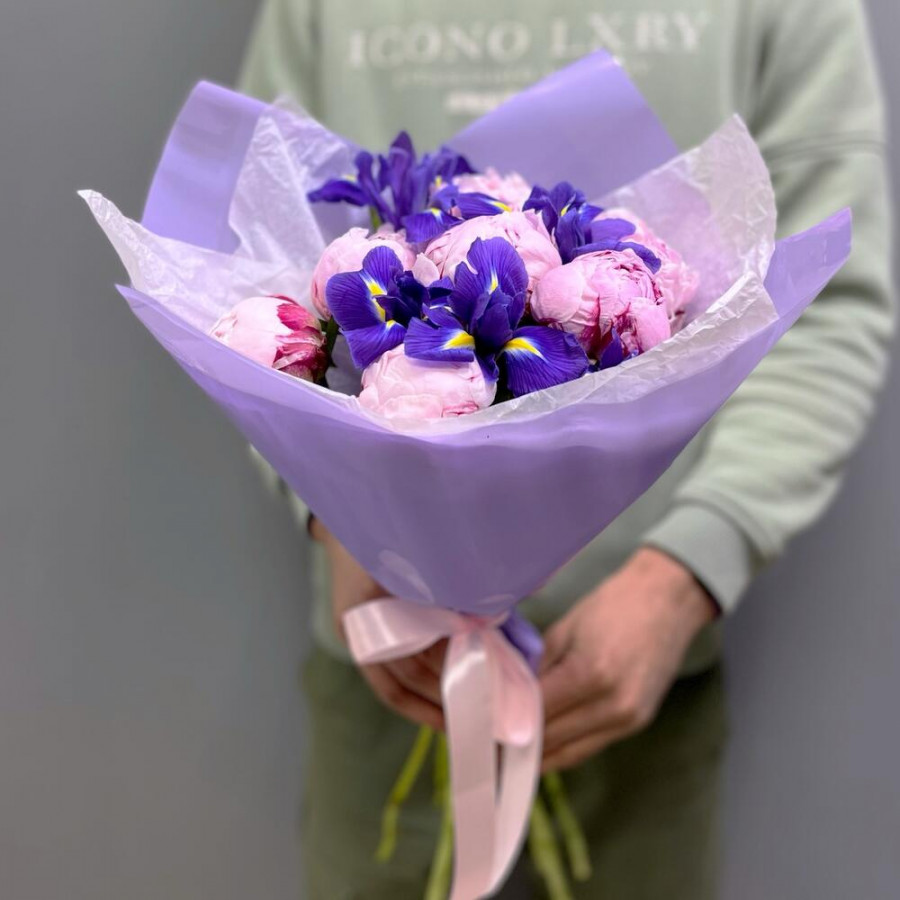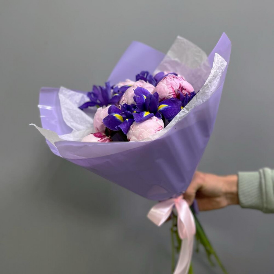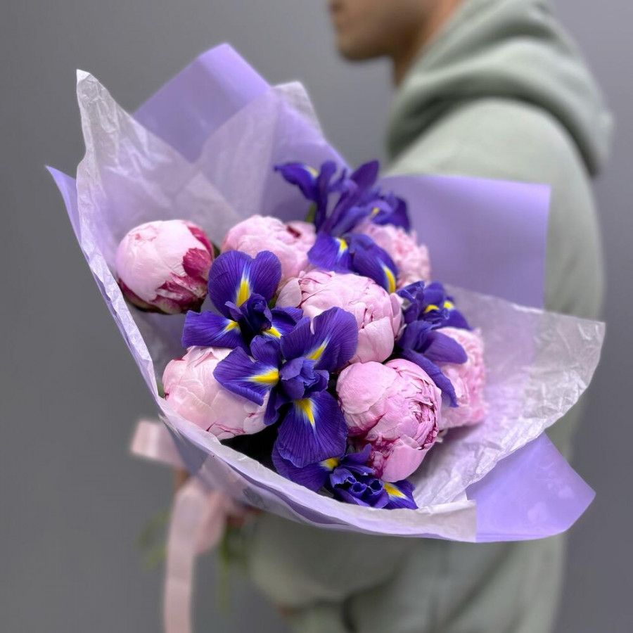 На фото букет из розовых пионов и ирисов. В составе: пион 7 шт, ирис 5 шт, дизайнерская упаковка 1 шт, атласная лента 1 шт, . Все цветы свежие и ароматные, букет красиво оформлен и отлично подходит для подарка. Доступна доставка цветов или самовывоз.