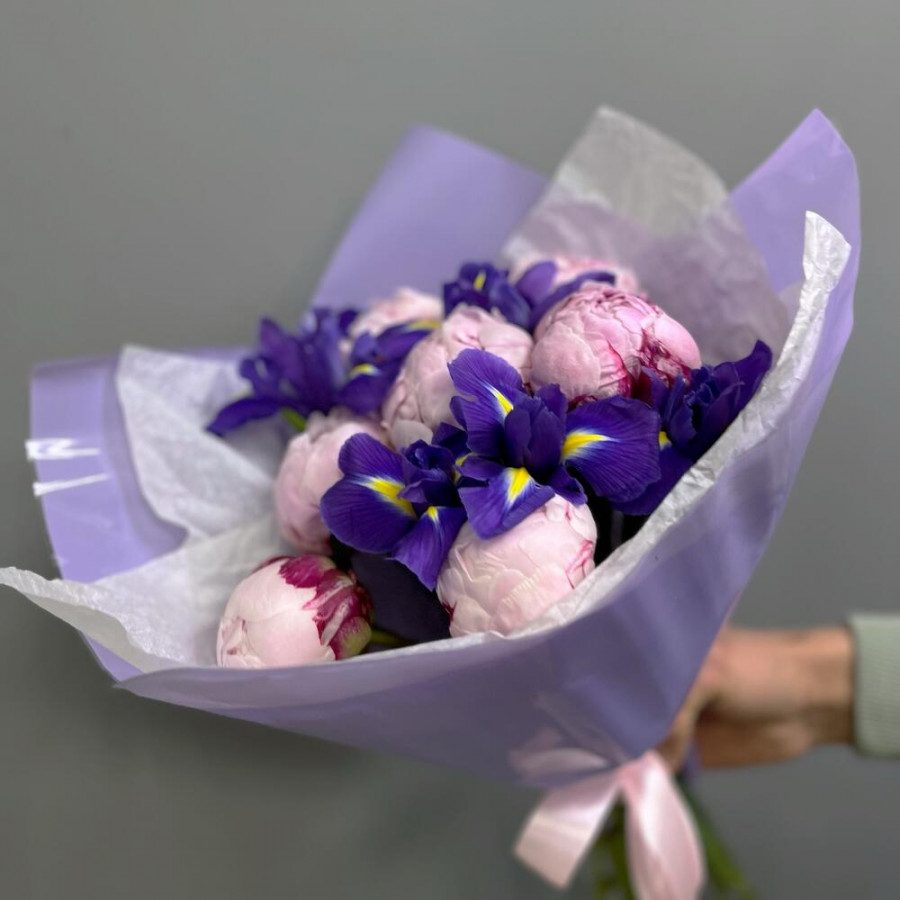 Букет из розовых пионов и ирисов