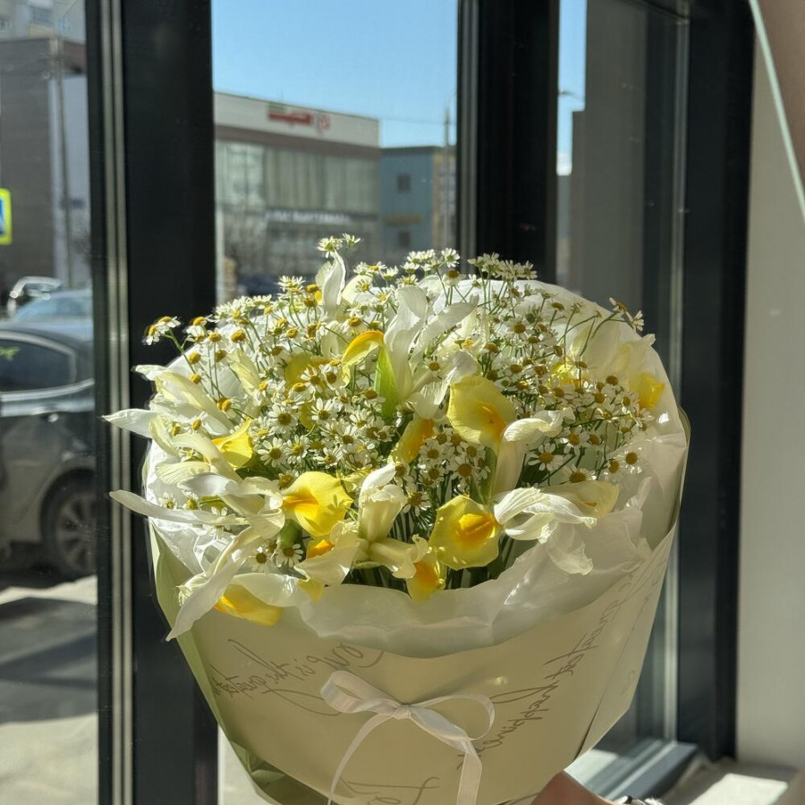 На фото букет из желтых ирисов и ромашек. В составе: ирис 7 шт, танацетум 10 шт, дизайнерская упаковка 2 шт, атласная лента 2 шт, . Все цветы свежие и ароматные, букет красиво оформлен и отлично подходит для подарка. Доступна доставка цветов или самовывоз.