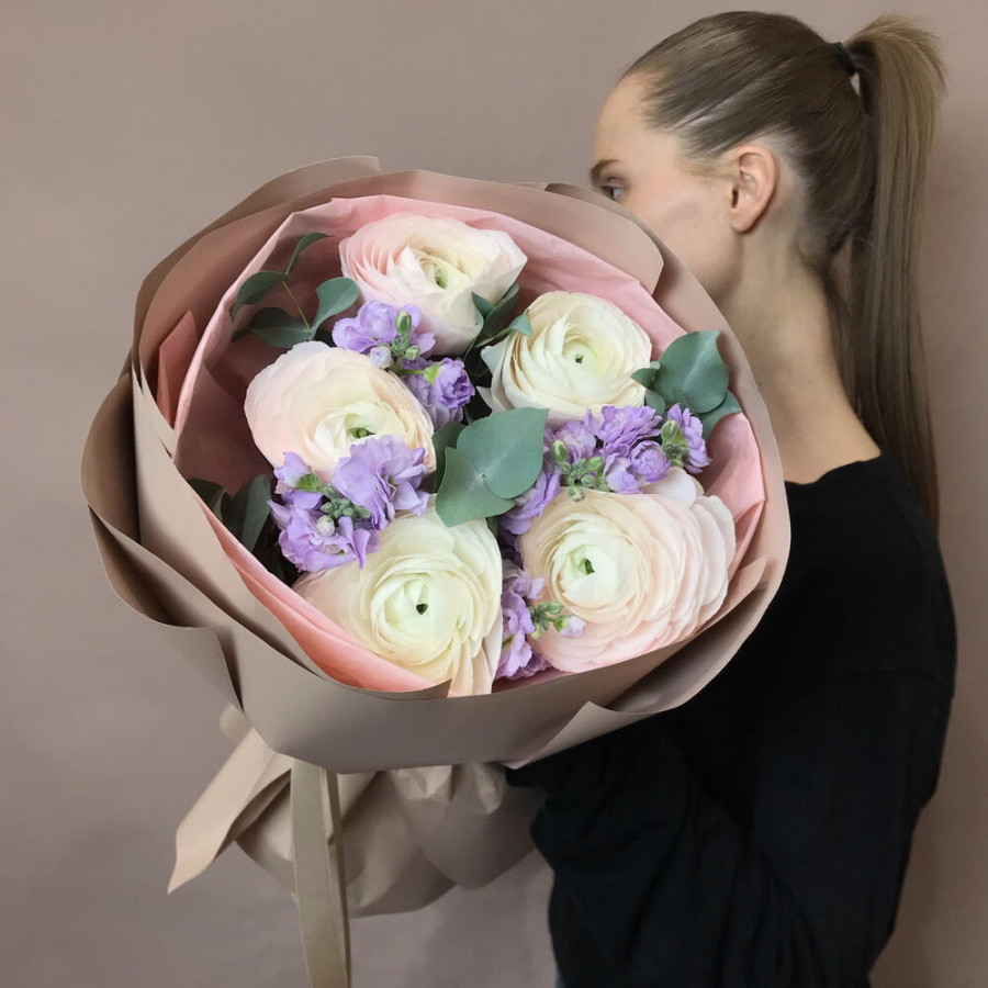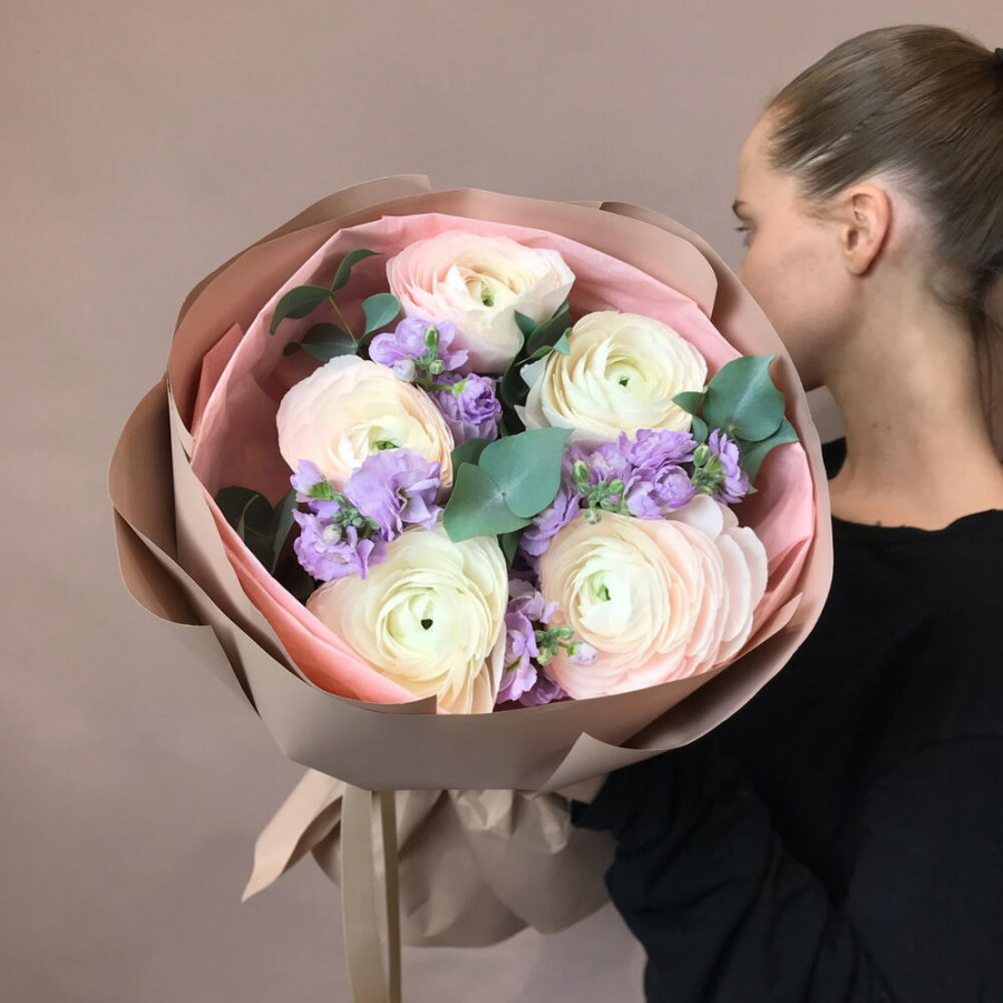 Букет из розовых ранункулюсов и сиреневой матиолы