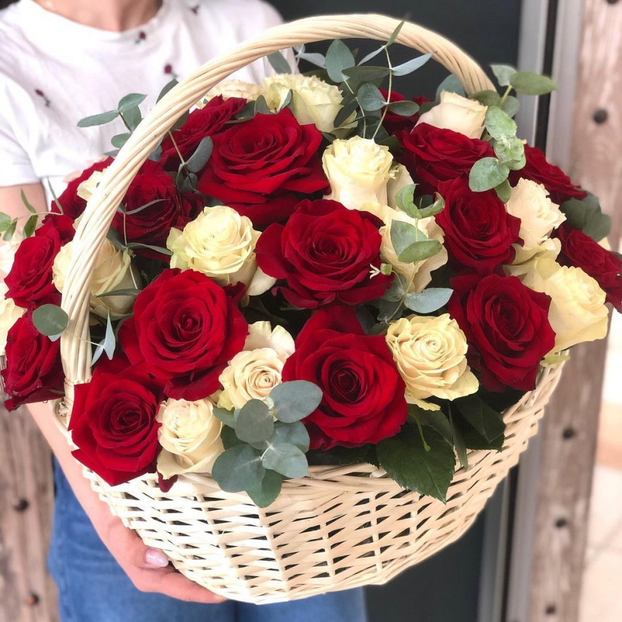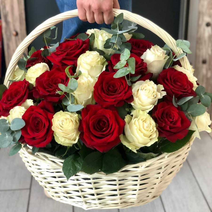 На фото красные и белые розы в корзине. В составе: роза 41 шт, эвкалипт 5 шт, аспидистра 4 шт, корзина (m) 1 шт, . Все цветы свежие и ароматные, букет красиво оформлен и отлично подходит для подарка. Доступна доставка цветов или самовывоз.
