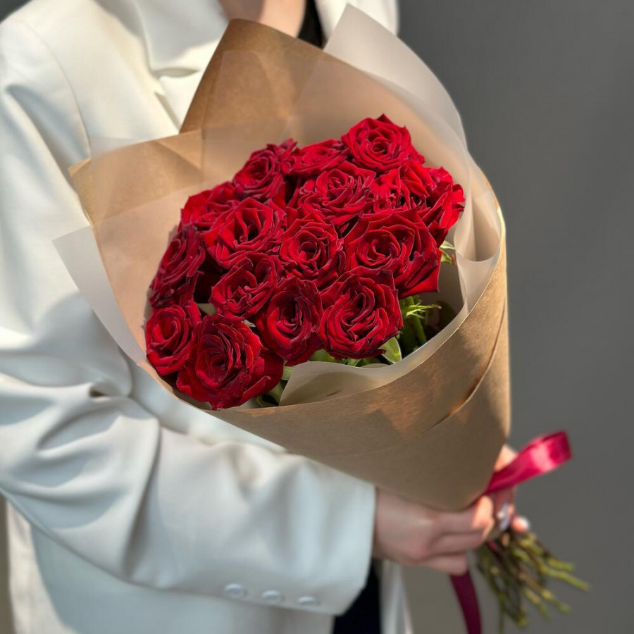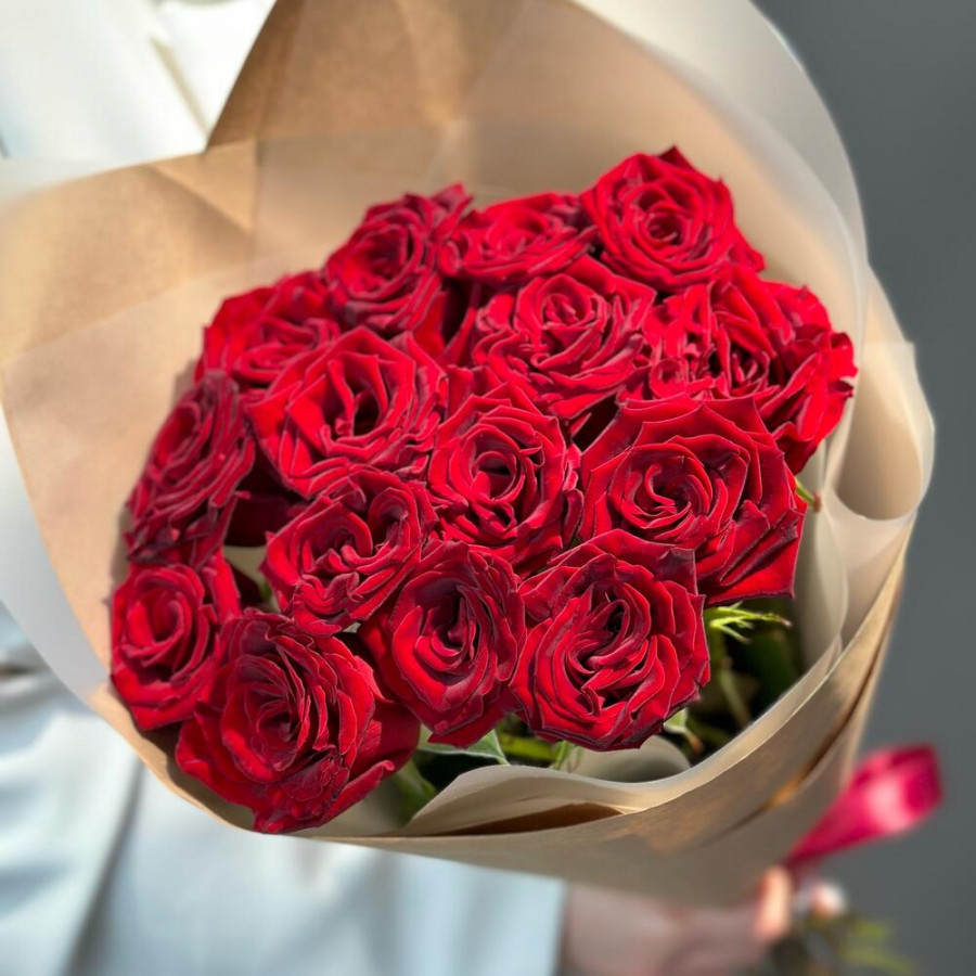 Средство для продления жизни цветов - 1 шт. Упаковка крафт - 1 шт. роза красная кения - 15 шт. записка с вашим текстом - 1 шт.